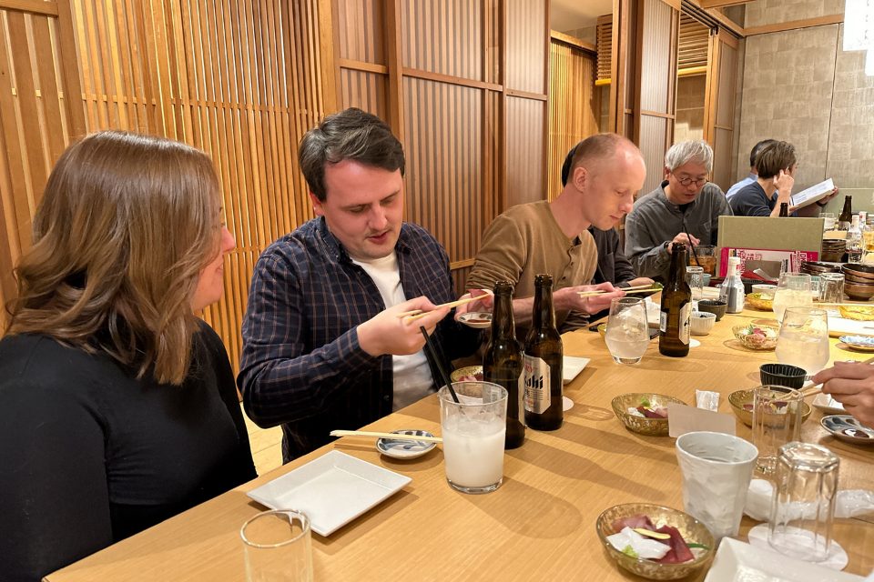 日本の忘年会文化や、初めて食べるお刺身、茶碗蒸しなど料理の話題で盛り上がりました。